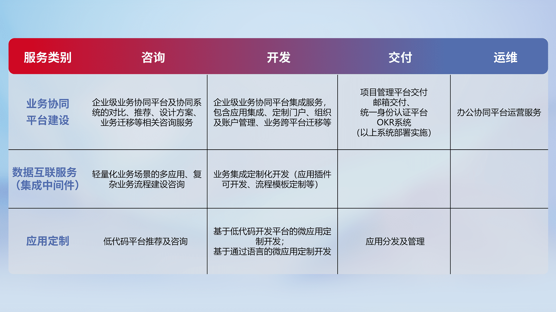 针对钉钉、、企微、、、IDaas等平台级产品提供产品的规划、、、方案、、交付、、、、定制化开发等服务,,,,实现如统一协同办公、、、、智能客户服务、、、混合会议管理、、智能数据查询、、、等业务场景,,实现数字化转型。。。